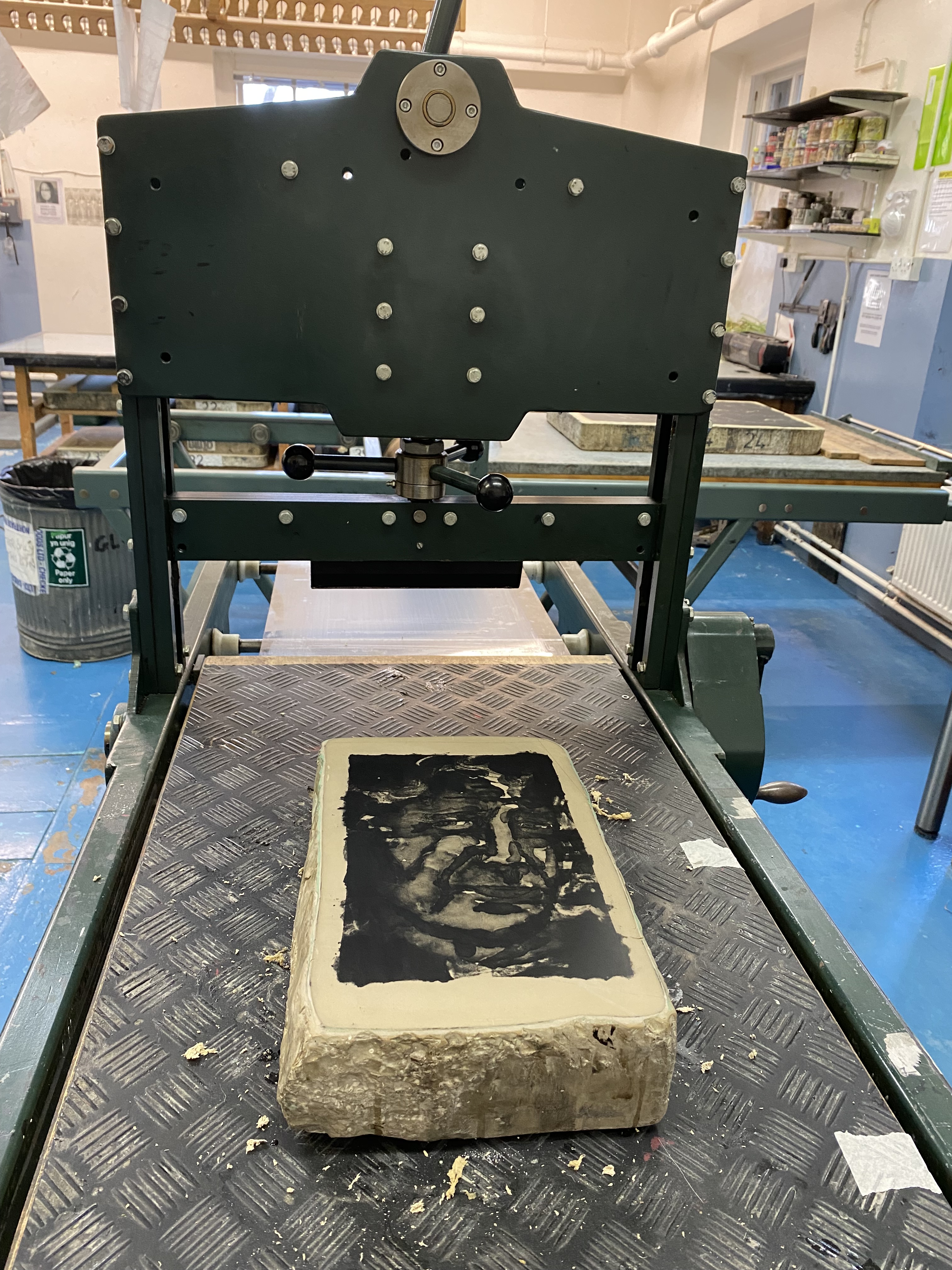 After doing this print I decided I definitely would like to work larger in future, this would allow me to make broader marks in the portrait. Below is a photo of a new stone I am starting based off the sketch to the left of the stone. It will be interesting trying to incorporate more faces in the stone to see how that works compositionally and also to try to incorporate more of Gerhard Richter’s technique of portrait that look fleeting and hazy.