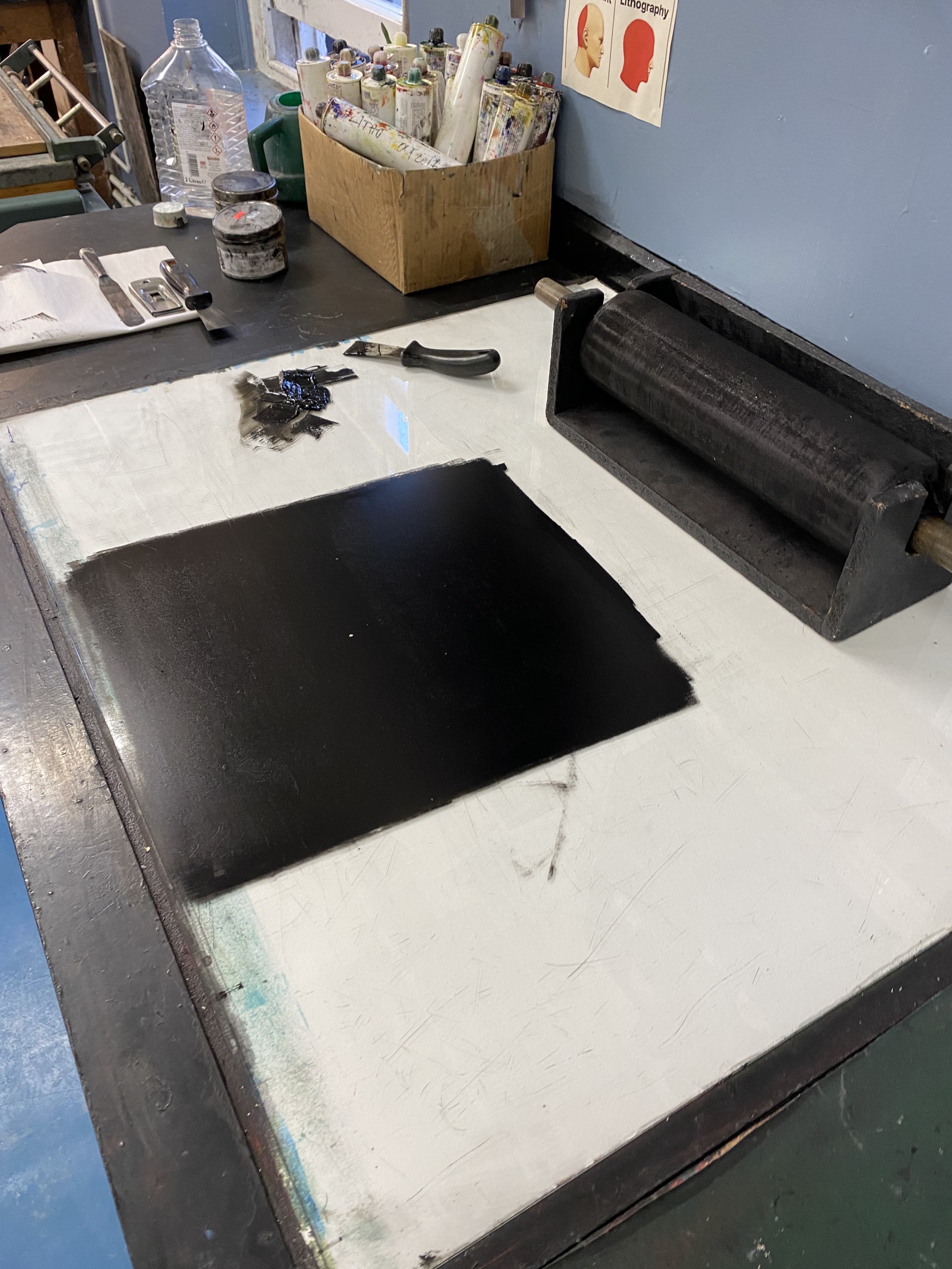 After finishing etching my stone last week my first thing to get started this week was finally to print. I have only done the printing process once before so it was all pretty new to me but we went through it step by step.