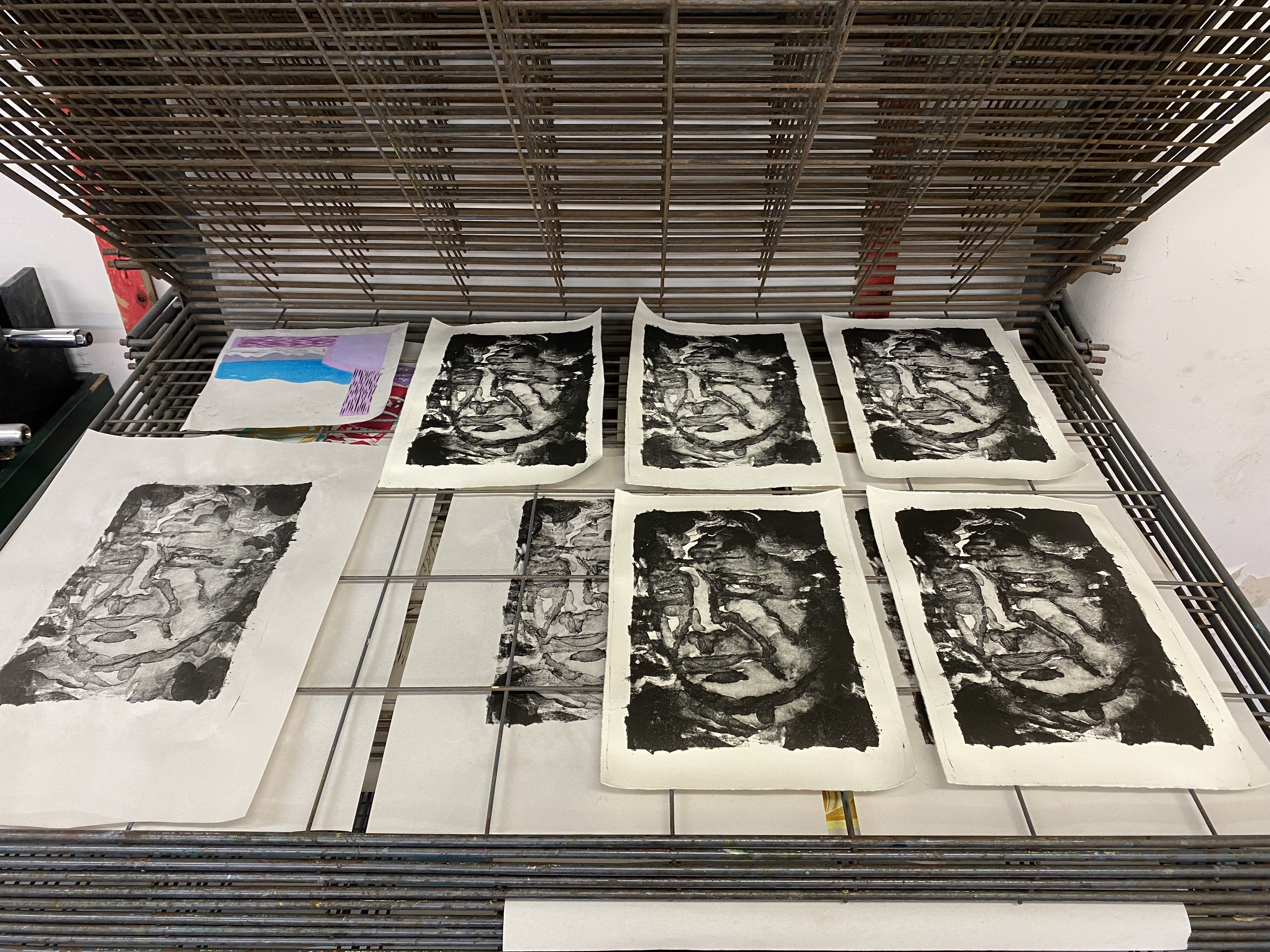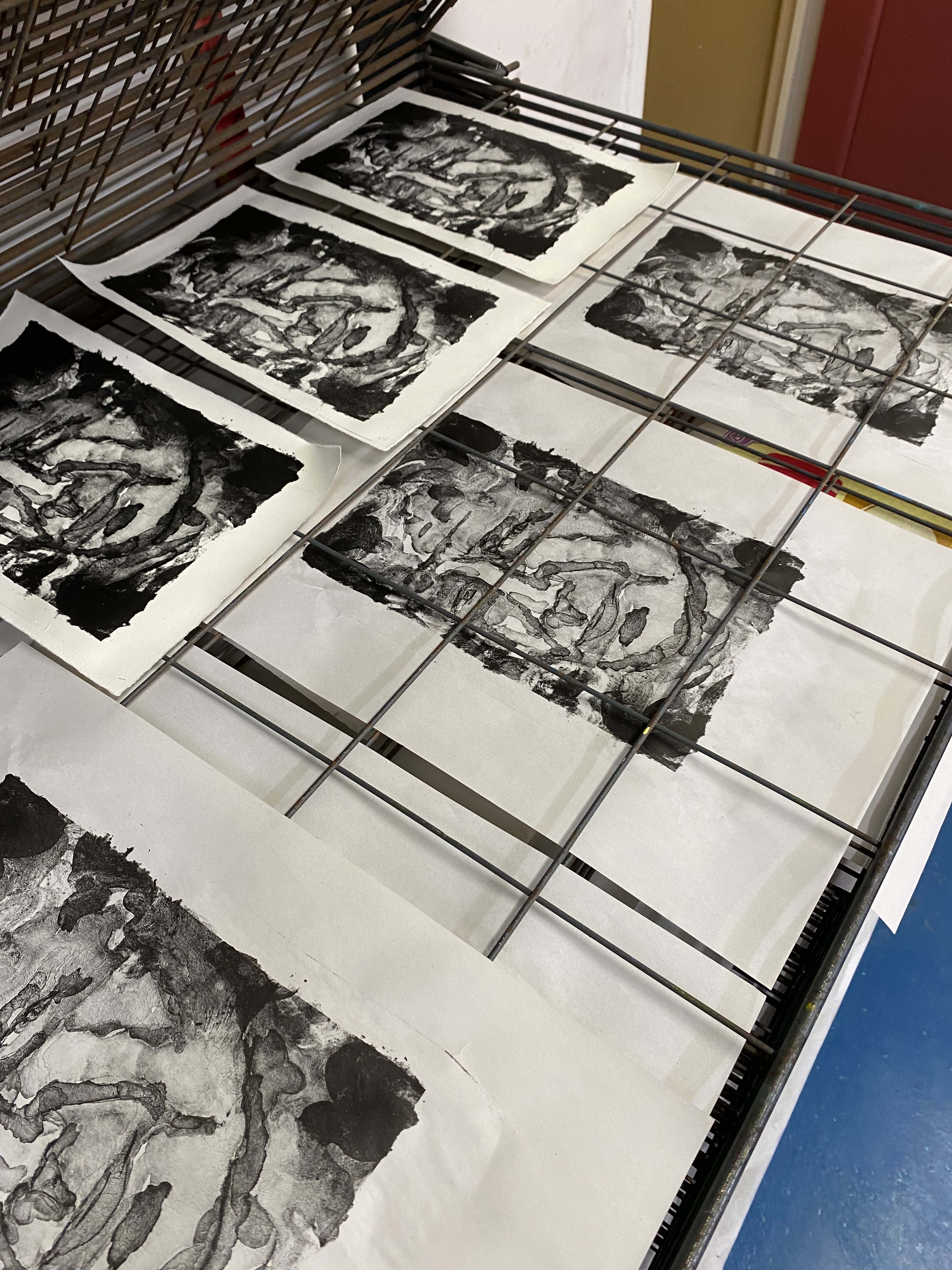 The three prints at the bottom of this photo were the first practice prints done on newsprint, because they were on newsprint they came out pretty faded and then when I printed on proper paper the print came out much more defined and dark. One thing I did struggle with was getting the print as dark as I wanted, this might have been because of how I was rolling the ink onto the stone, after having this chance to get used to the printing technique hopefully next time it will be easier.