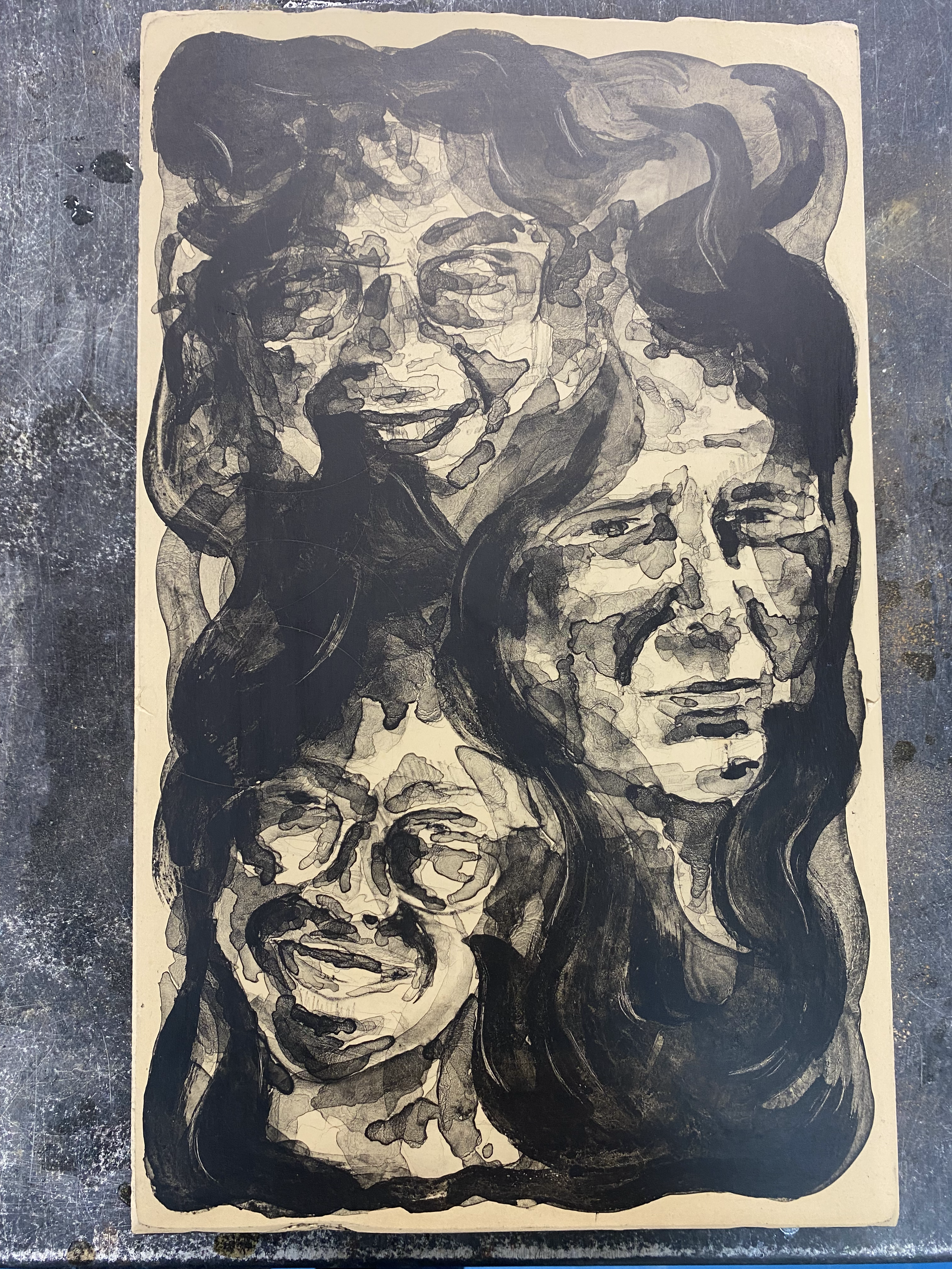 After both etching processes were complete, the stone inked up really well and I was happy with how the portraits turned out. One slight problem that was noticed was these visible circles that formed on the left of the stone, these must have happened when I originally ground the stone, because when grinding the stones with the different levels of grit if they get mixed after not washing the stone and surrounding area throughly it can create these circular scratches in the stone. This is something I will look out for more thoroughly in the future.