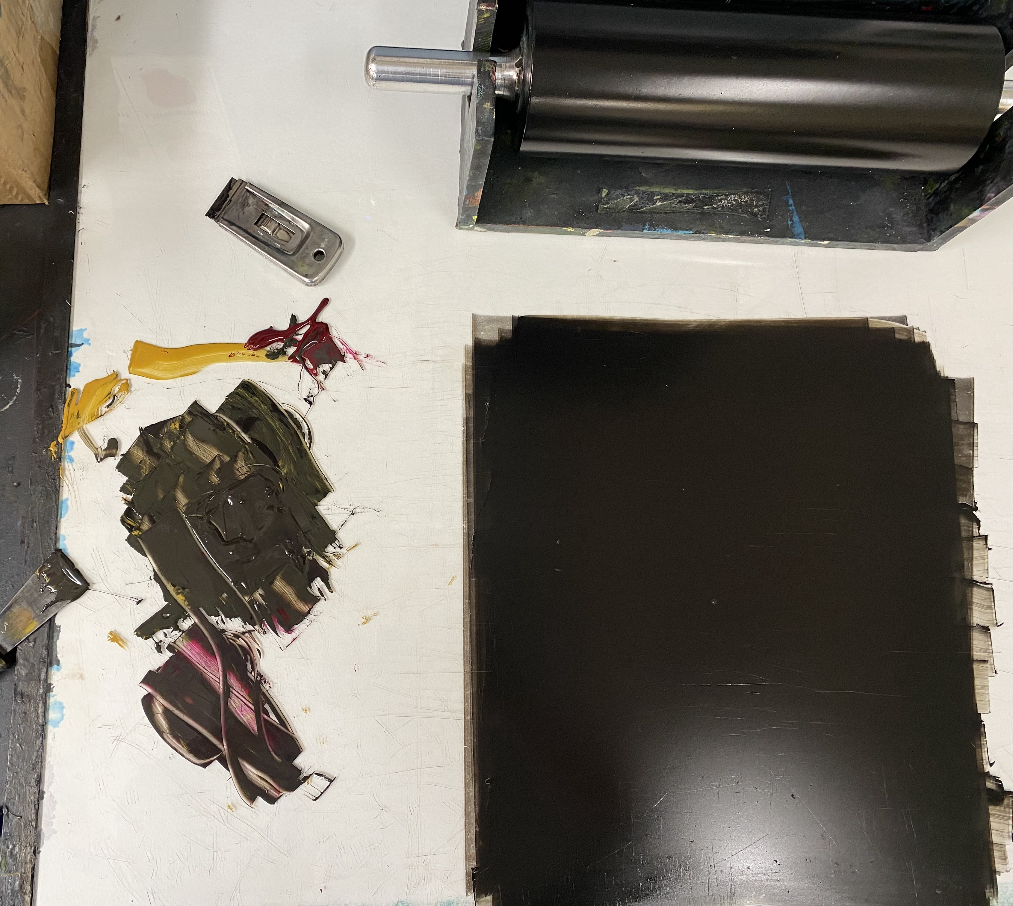 The print came out really nicely on the Rives Tan paper, as it did last time so moving forward I will definitely use this as my primary paper, however after printing with the black ink I wasn’t getting quite the result I wanted. It wasn’t quite dark enough in places so I decided to try colour printing.