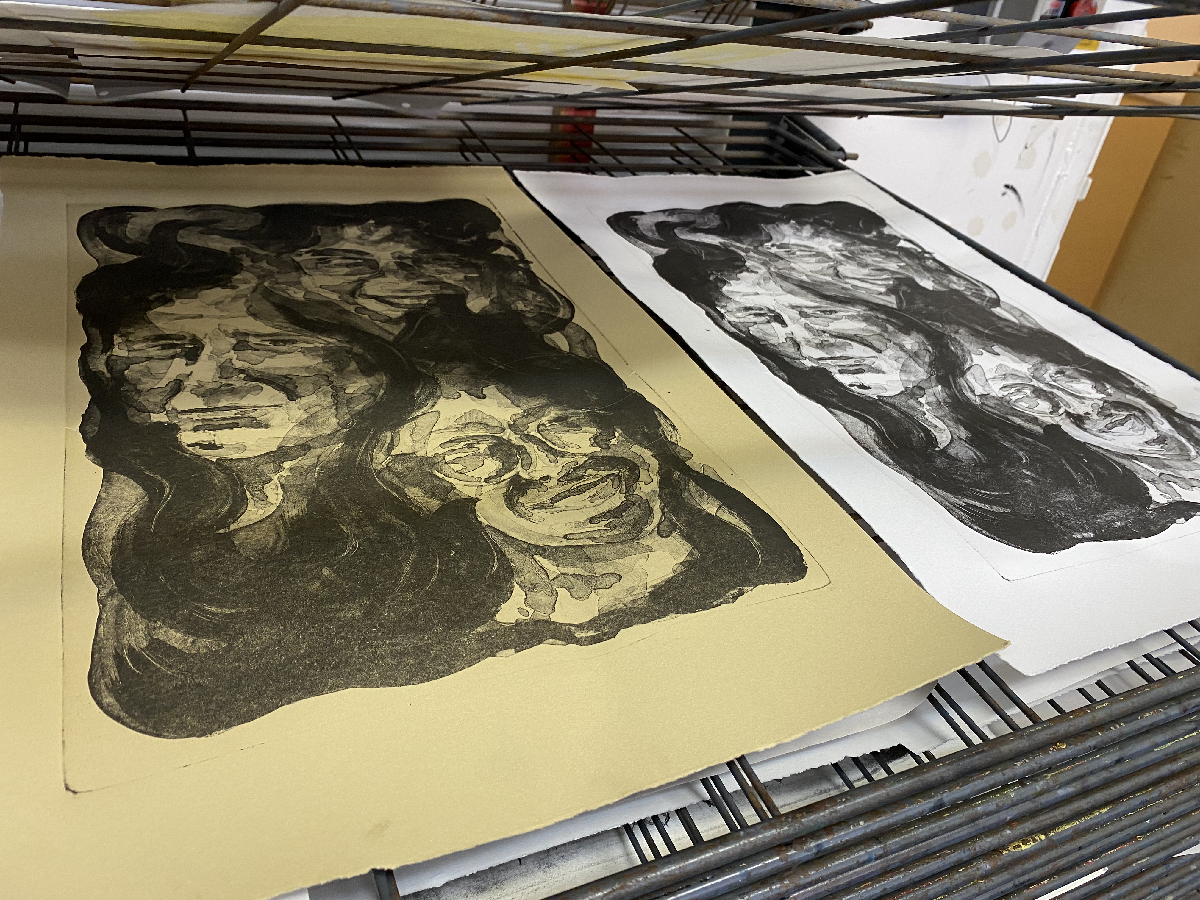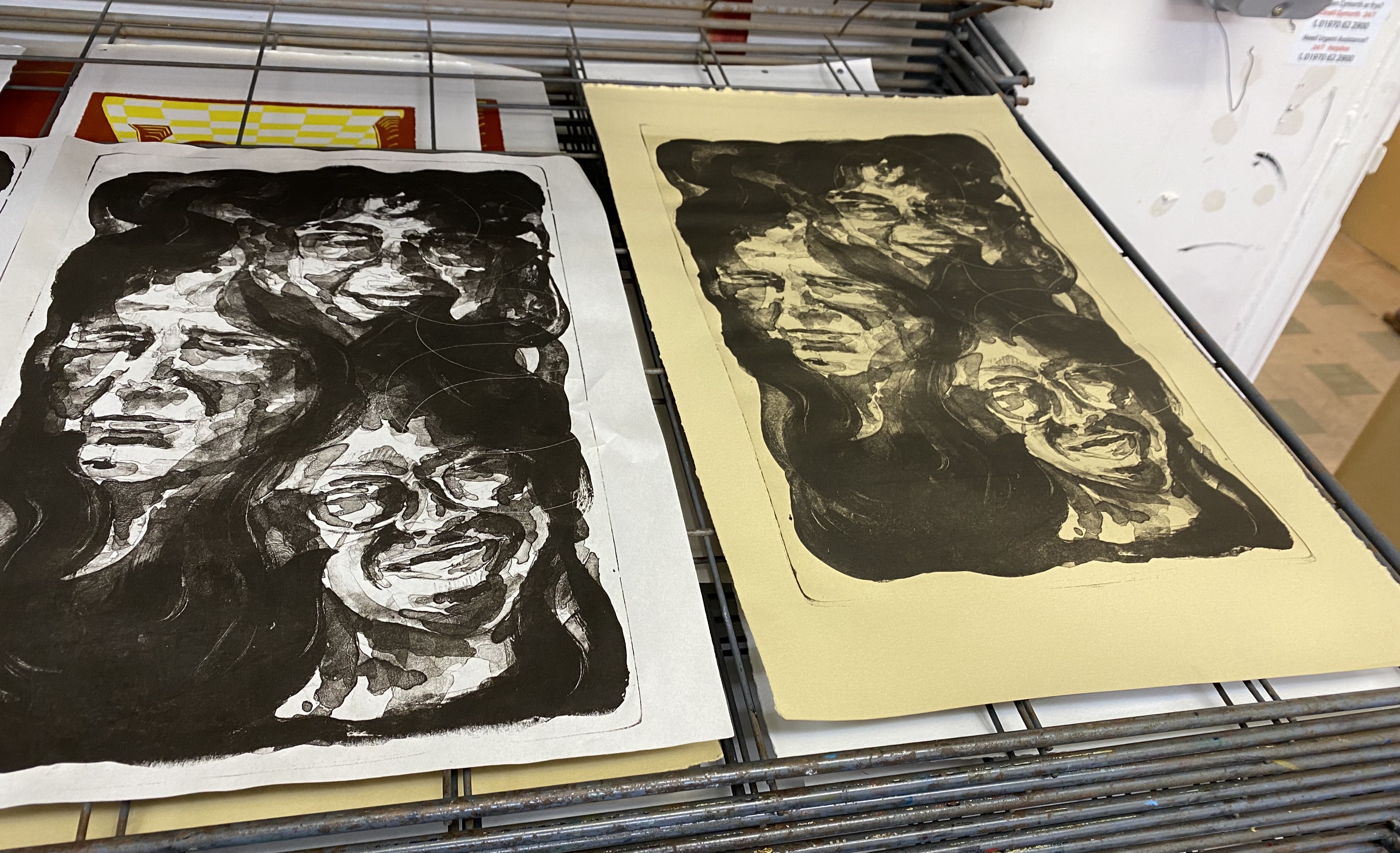 I wanted a brown colour to try and replicate and almost aged photograph look for the print, we first tried sepia but it came out very cool toned and dark so we added an ochre and crimson to the initial ink and it became a warmer brown. What I noticed straight away was when rolling this coloured ink onto the stone it went on much easier and smoother compared to the black ink which takes a bit more pressure. This was much better for my lithograph as it produced a much darker and intense colour quickly. The overall result below came out well, I think the brown was still slightly too dark so next time I would like to lighten it and perhaps make it more orange toned to get a real sepia colour.