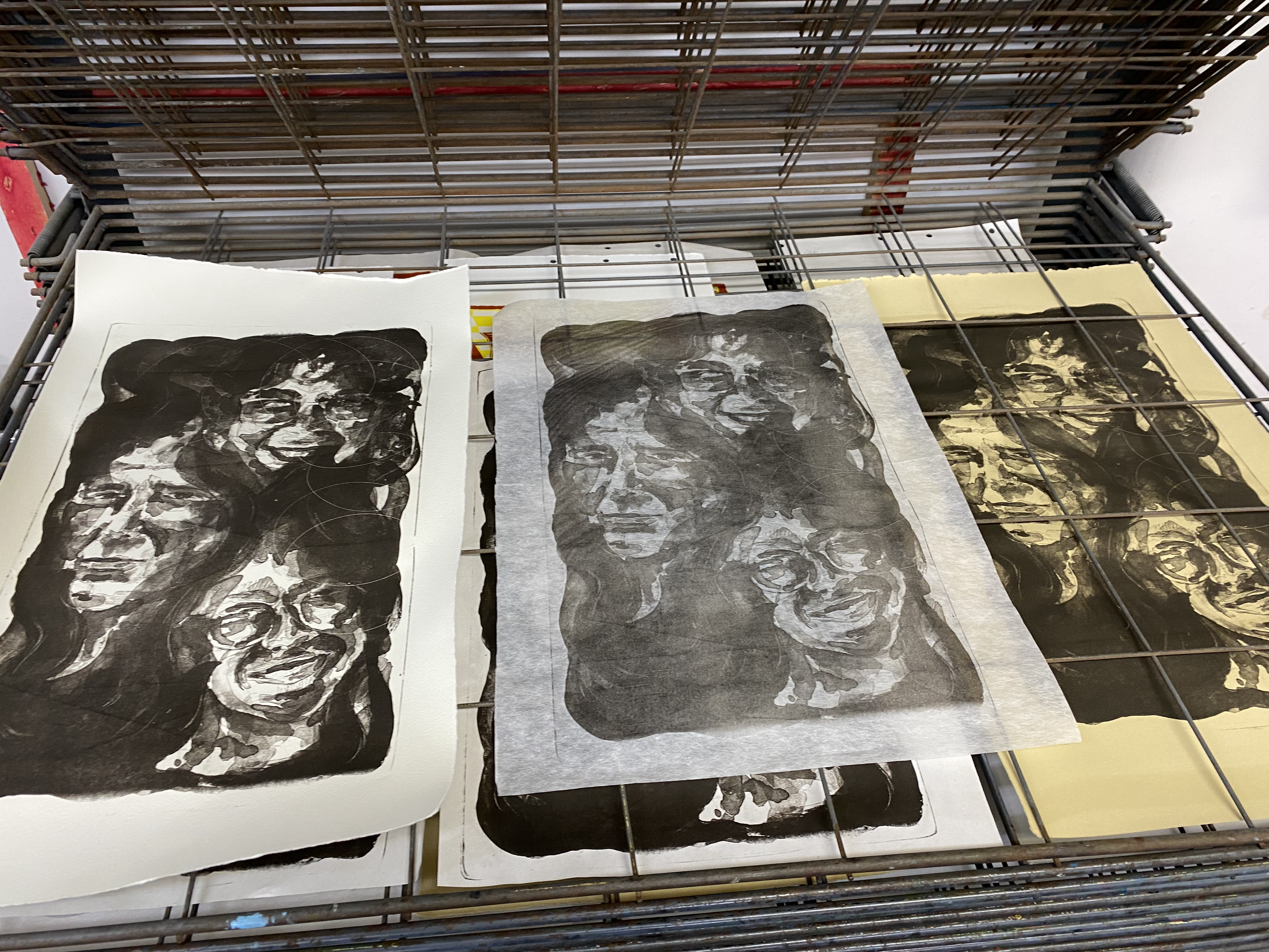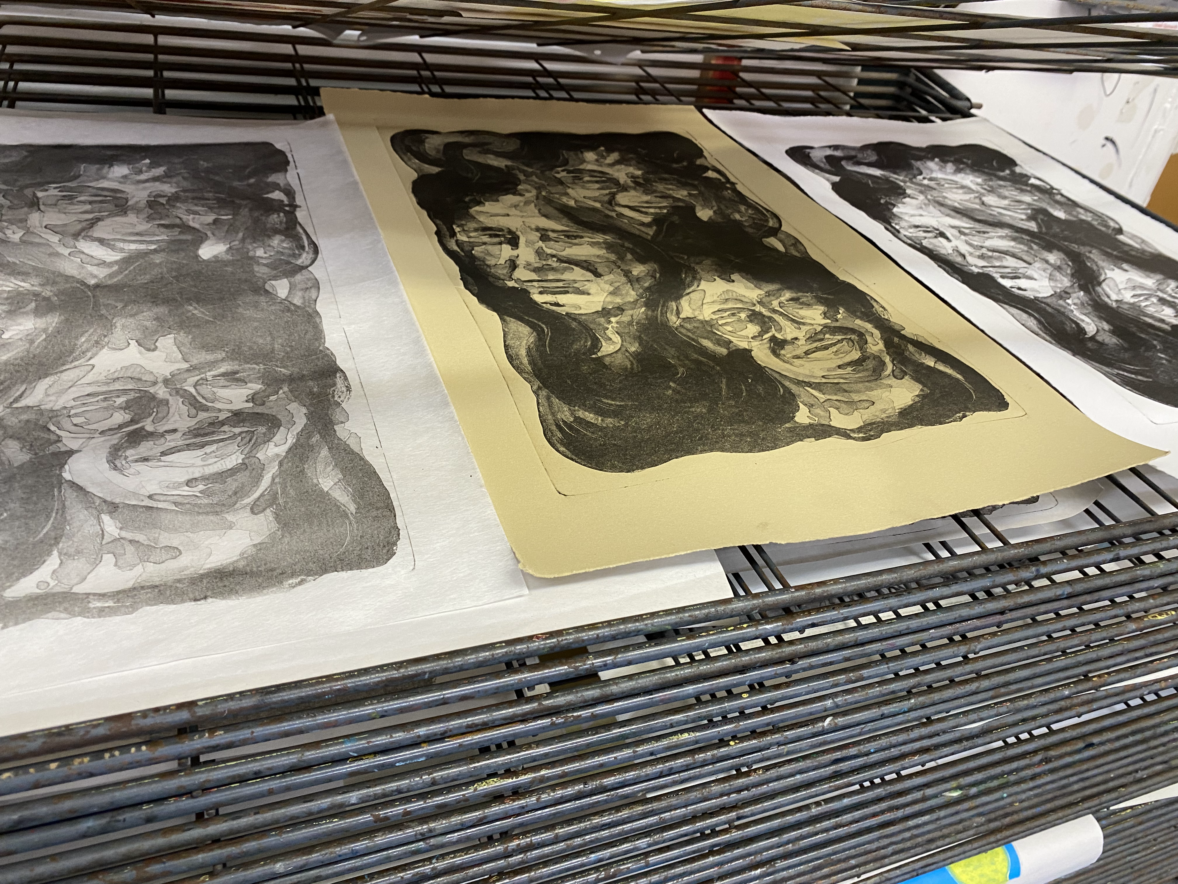 After etching my stone last week I was ready to print this week, again I used three different types of paper to continue to see how my prints look and feel like on different paper, these being; Somerset Satin White, Hahnemuhle and Rives Tan and a very thin Japanese paper.