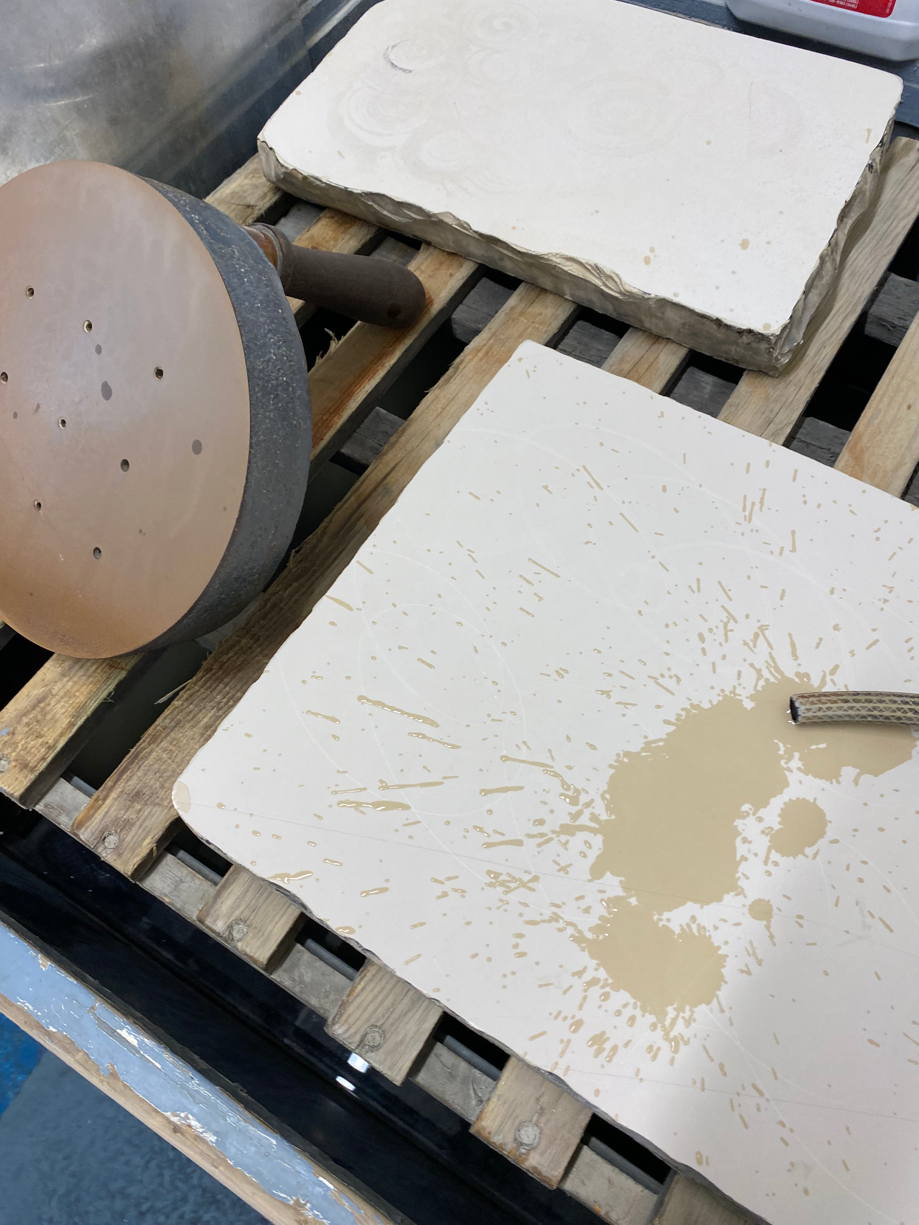 I started off the week, re-graining this stone below as last week when I did it circular scratches appeared in the stone surface, most likely as a result of me managing to get some grit mixed up between changing the grain. But with a re-do the scratches came out so I was ready to be able to use the gum transfer paper on it.