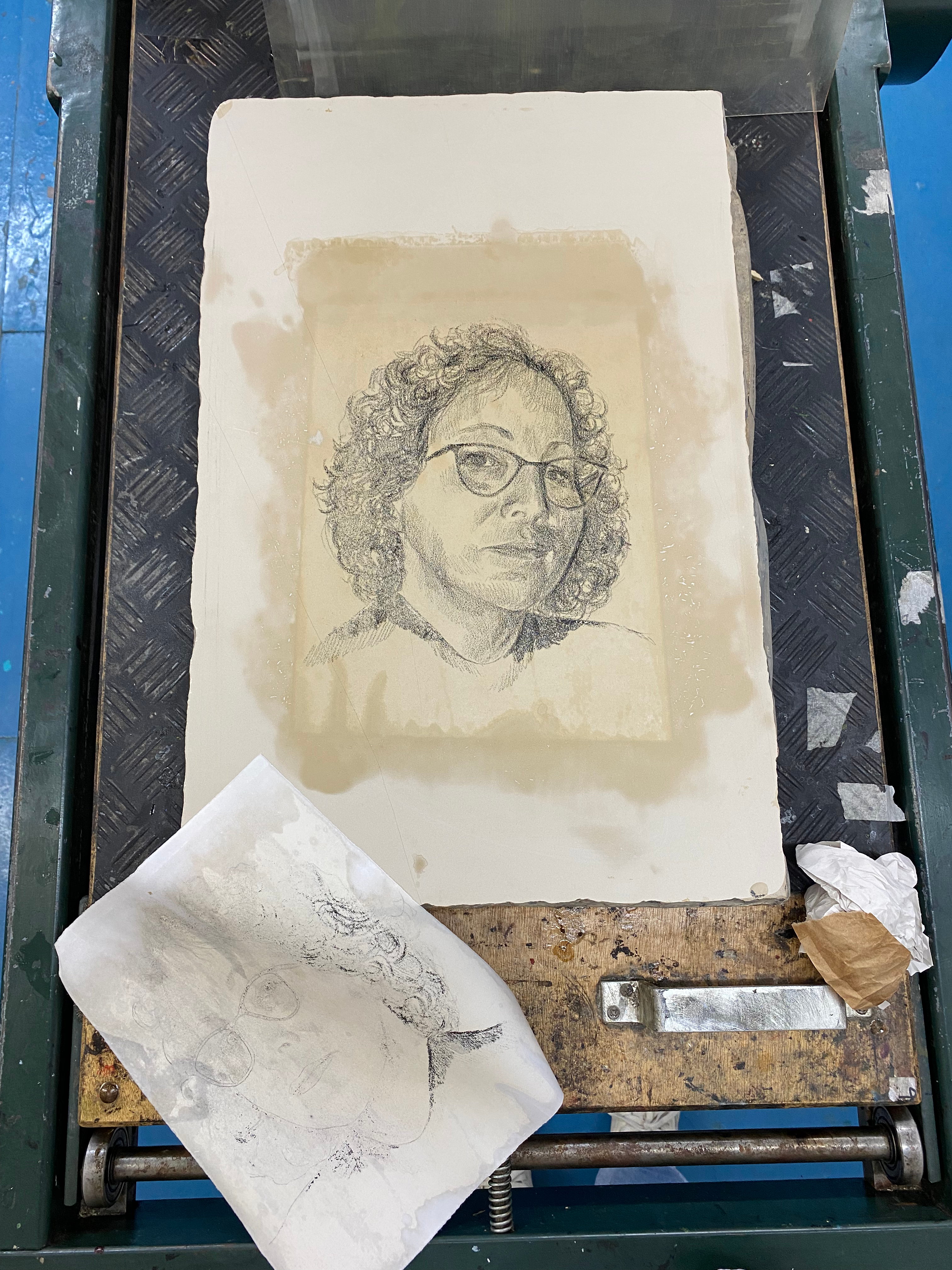 I have not used gum transfer paper but the process was pretty simple and just involved wetting the paper on the stone and putting it through the press – repeating this process a few times until the image was transferred onto the stone. So when peeled off I was left with this portrait on the stone ready to be printed.