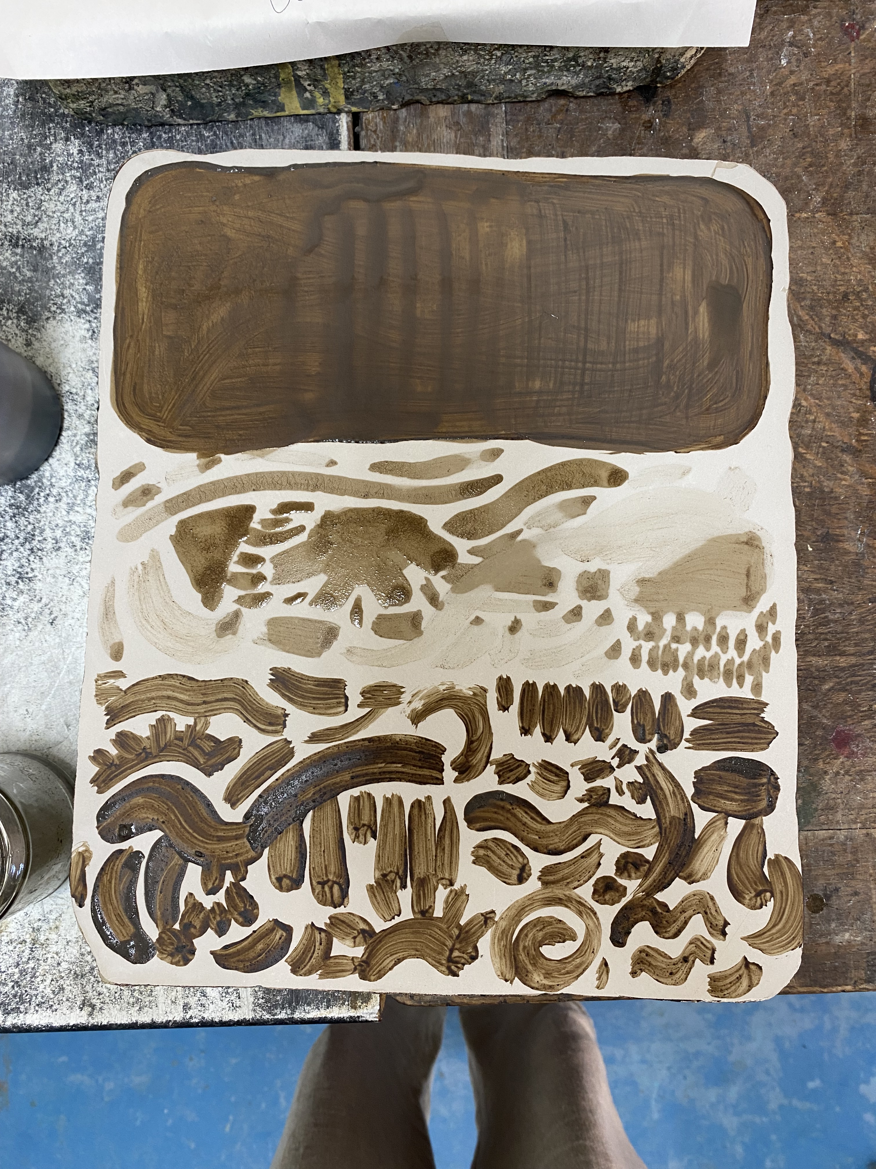 I now going forward have quite a lot to think about before I can start my proper works for my exhibition, including how to approach the background of the portraits, the colour of the marks, the colour of the portrait and composition. To start experimenting I have made up a stone below using brown ink, with solid shapes at the bottom, watered down shapes in the middle and a solid block at the top in which I will etch shapes into it. I will print this in different colours to see how it could look and what is the most effective technique going forward with my work.