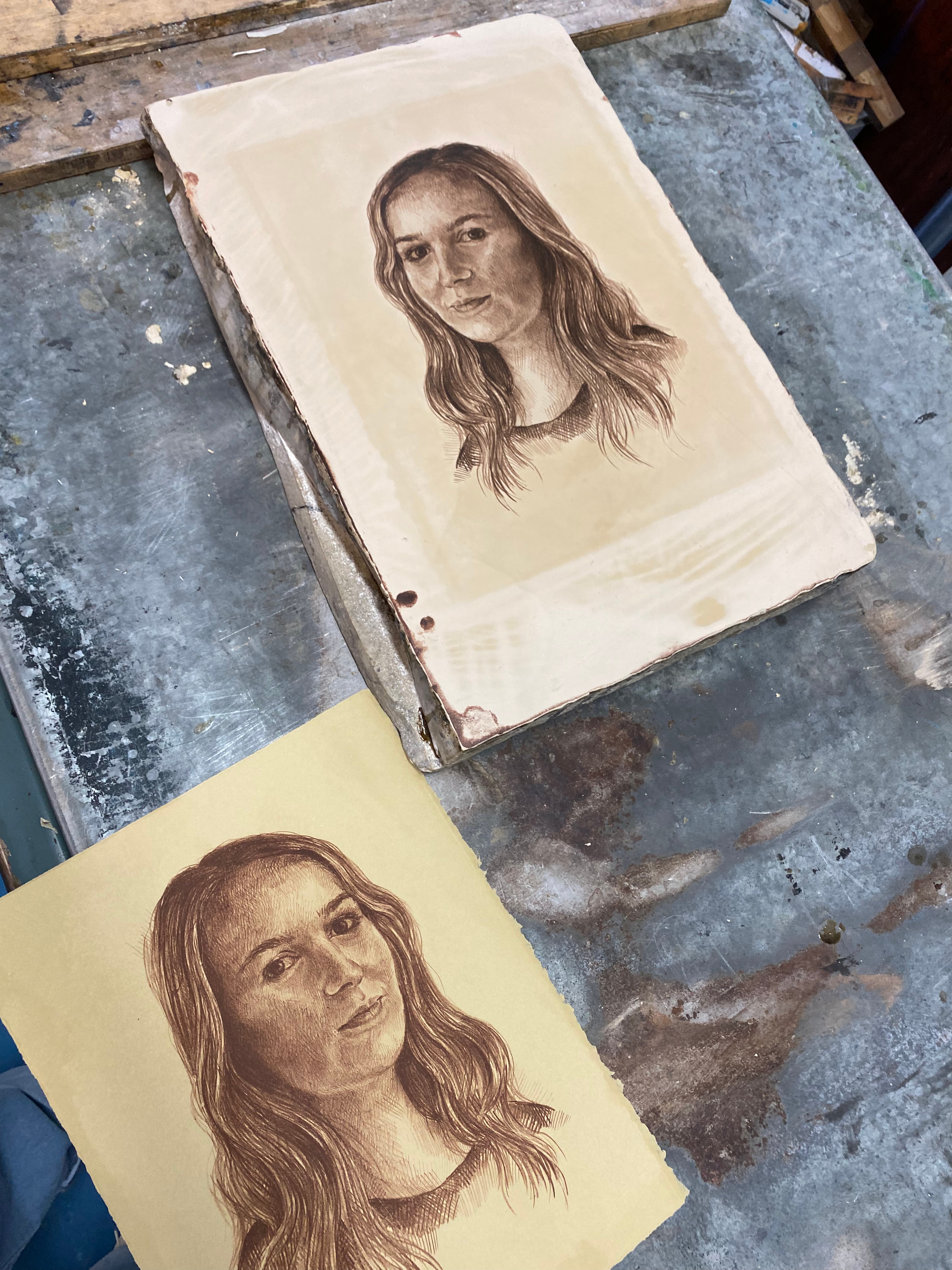 This is the final print, I had a slight bit of trouble with the top of the hair as the ink very quickly became too thick in the darkest areas creating a bit of excess on the print which didn’t look great. But by ensuring that I rolled off the excess ink enough before printing I got some good prints from this stone.